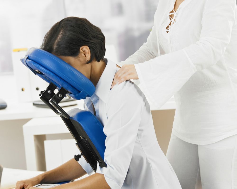 El masaje en silla, se realiza en una silla ergonómica y también con otros elementos más simples. El objetivo, es la capacitación para realizar el masaje en un corto lapso y que genere una rápida respuesta, es ideal para atender personal de empresas que por las posturas incorrectas se sientan incómodos y si rendimiento en horario laboral está reducido de manera notable. Es un masaje ideal para personas que tienen corta disponibilidad horaria.